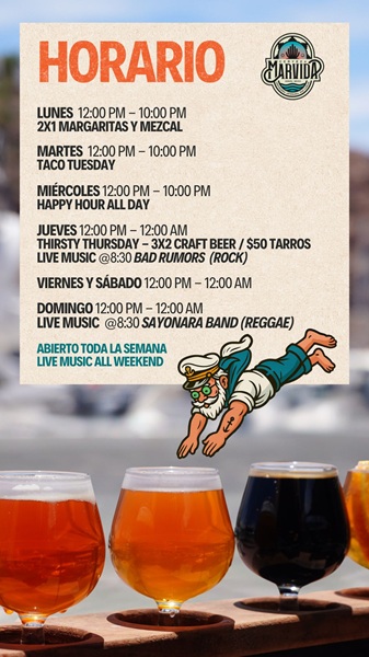 No beer this good can be quaffed without the best food in San Carlos on the side. Whether it’s delicious hand-made pizza, tasty burgers including the popular Marvida Shrimp Burger, Fish and Chips, Hot Dogs, Aguachiles, signature salads and creative side dishes, Marvida’s got you covered. For meat lovers and vegans — there’s something for everyone on our menu!