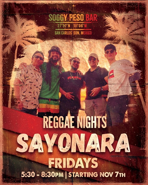 Starting Friday, November 7, Reggae Nights with Sayonara. 5:30pm – 8:30pm, Soggy Peso.